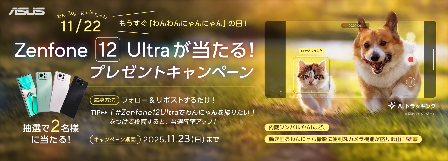 抽選で2名に高性能ジンバルが内蔵された最新スマホ「Zenfone 12 Ultra」が当たりますので、激しく動き回るご自慢のワンニャンもブレずに綺麗な画質で撮影することが可能です。