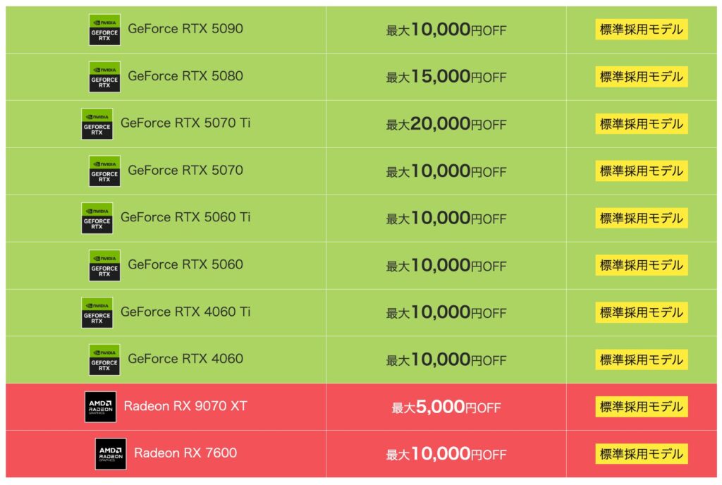 ゲーミングPCといえば、GPUパワーが描写性能を左右しますが、人気のGeForce RTX 50シリーズが期間限定で値引きされます。