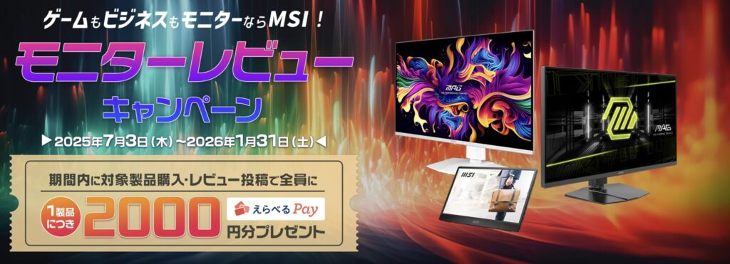 こちらのキャンペーンでは、高品質なMSIのモニターを購入&レビュー投稿した方全員に、選べるpay2,000円分がプレゼントされるという内容です。
