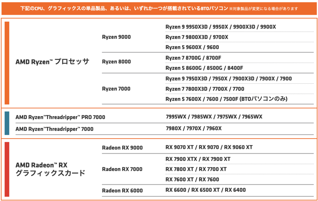 AMD製のCPU・GPU単体、またはそれらを搭載したBTOPCが対象!