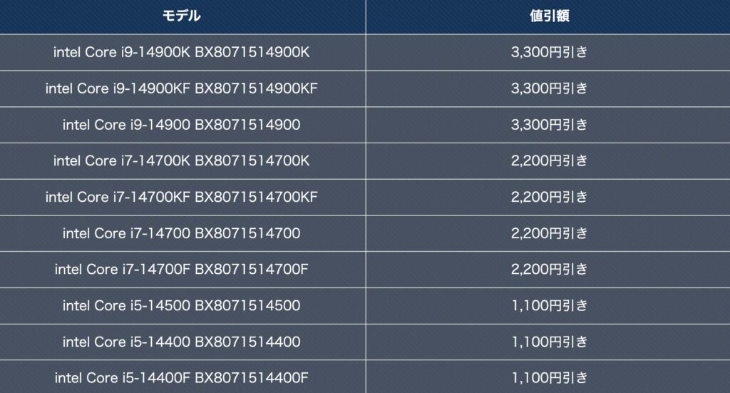 ご覧の通り、インテルの売れ筋CPUが対象となっておりますので、無くなる前に新規購入または買い替えを検討してみてはいかがでしょうか。(一部売り切れとなっておりますので急ぎましょう!)