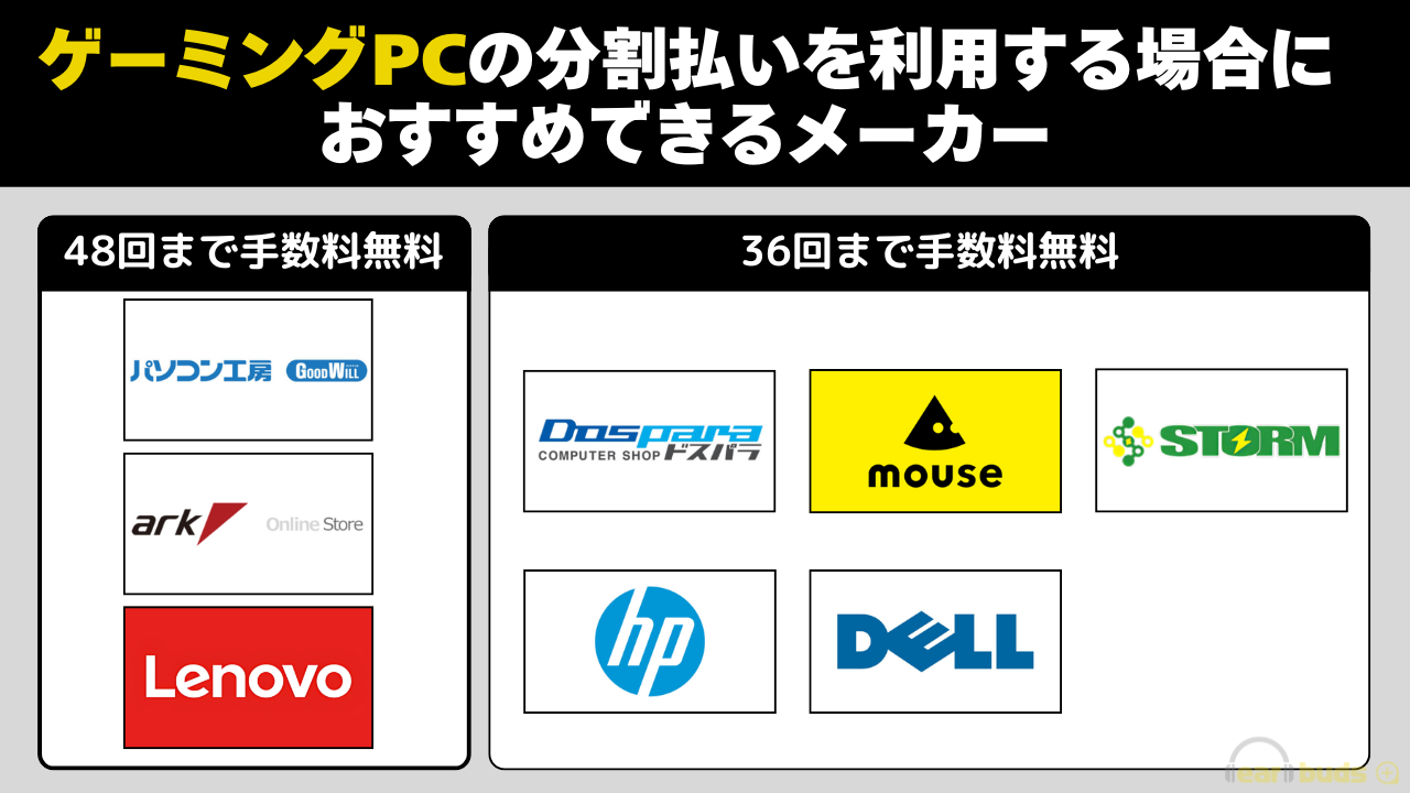 分割払いの利用が最もおすすめなメーカーは「パソコン工房」「Ark」「レノボ」だよ!