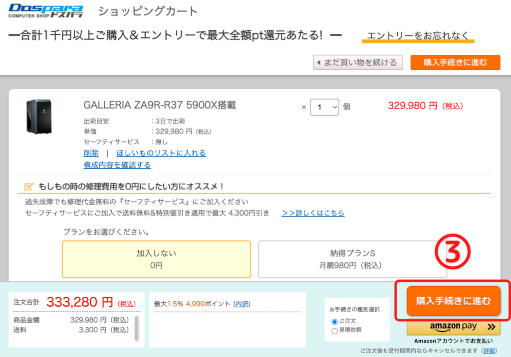 ドスパラ会員からログアウト完了したことを確認出来たら、「amazon pay」「楽天pay」で購入したいPCまたはPCパーツをカートに入れます。