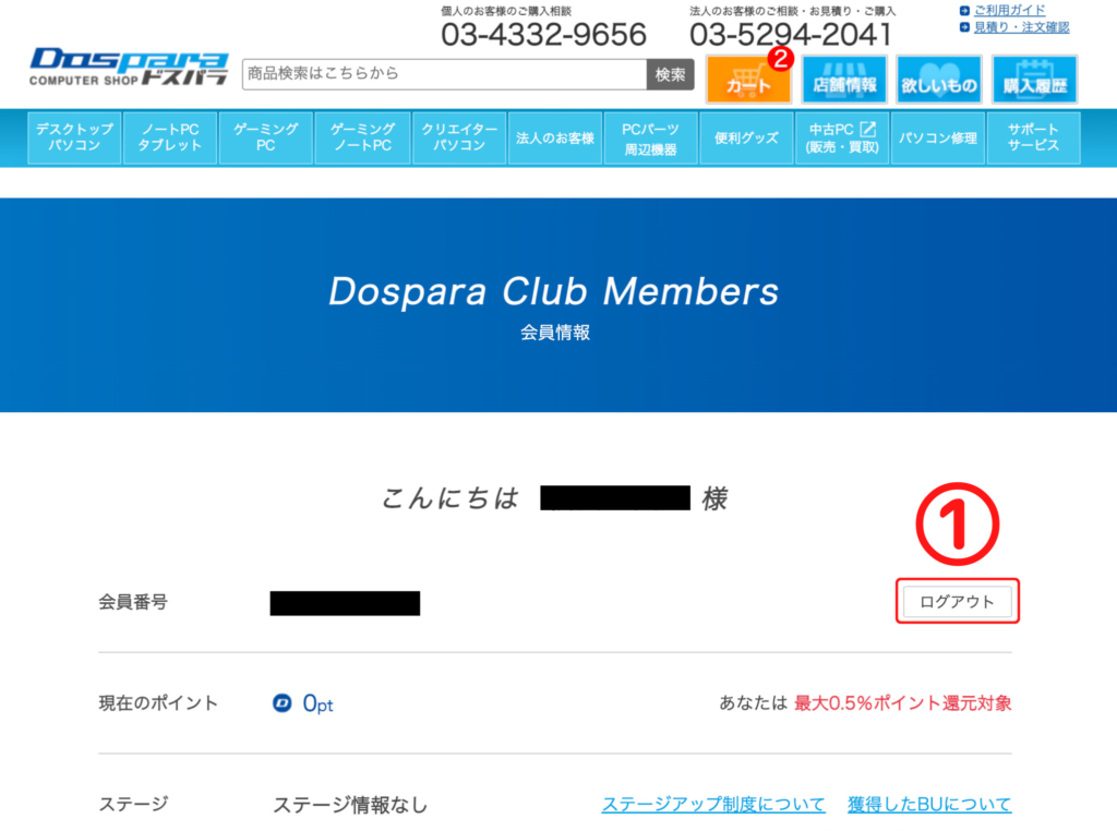 まずドスパラ会員ログアウトページに入り、ドスパラ会員IDにてログインされている方はログアウトを行います。