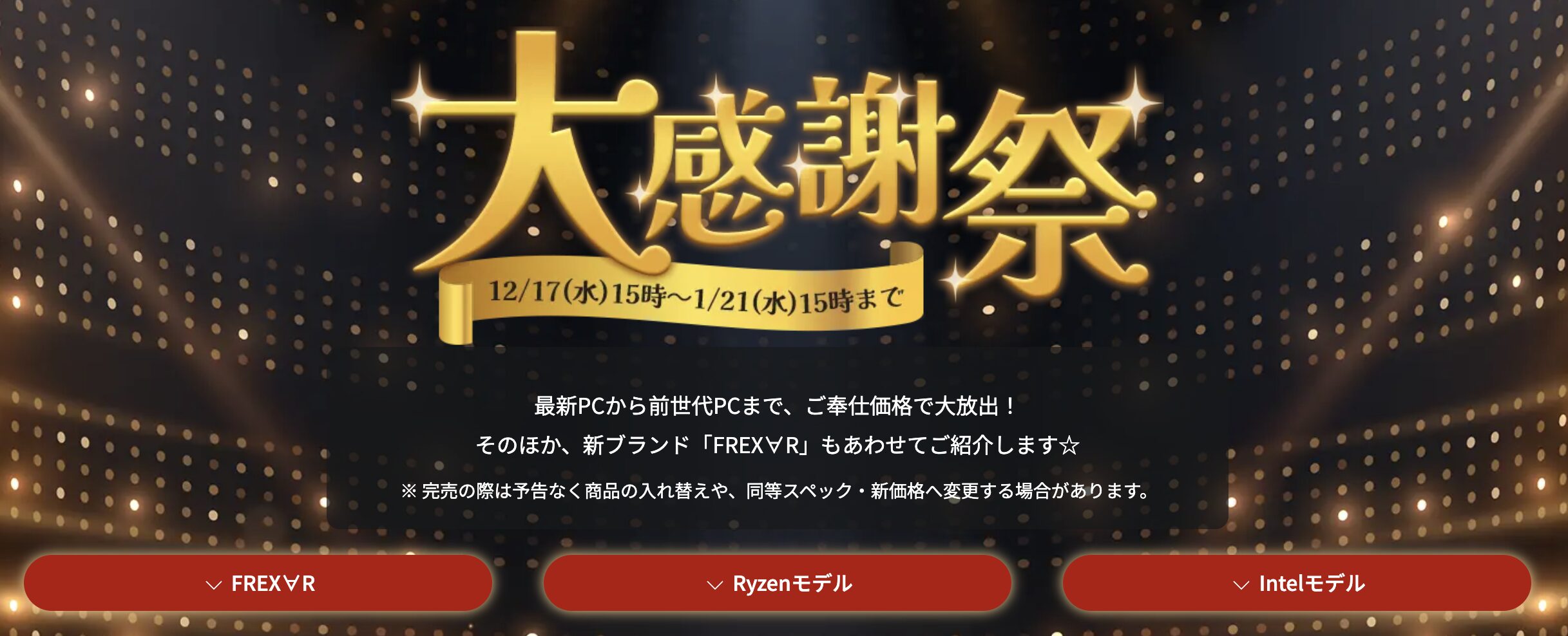 大感謝祭では「FREX∀R(フレクサー)」「Ryzenモデル」「Intelモデル」の3ジャンル、合計16モデルが限定特価で販売中です。
