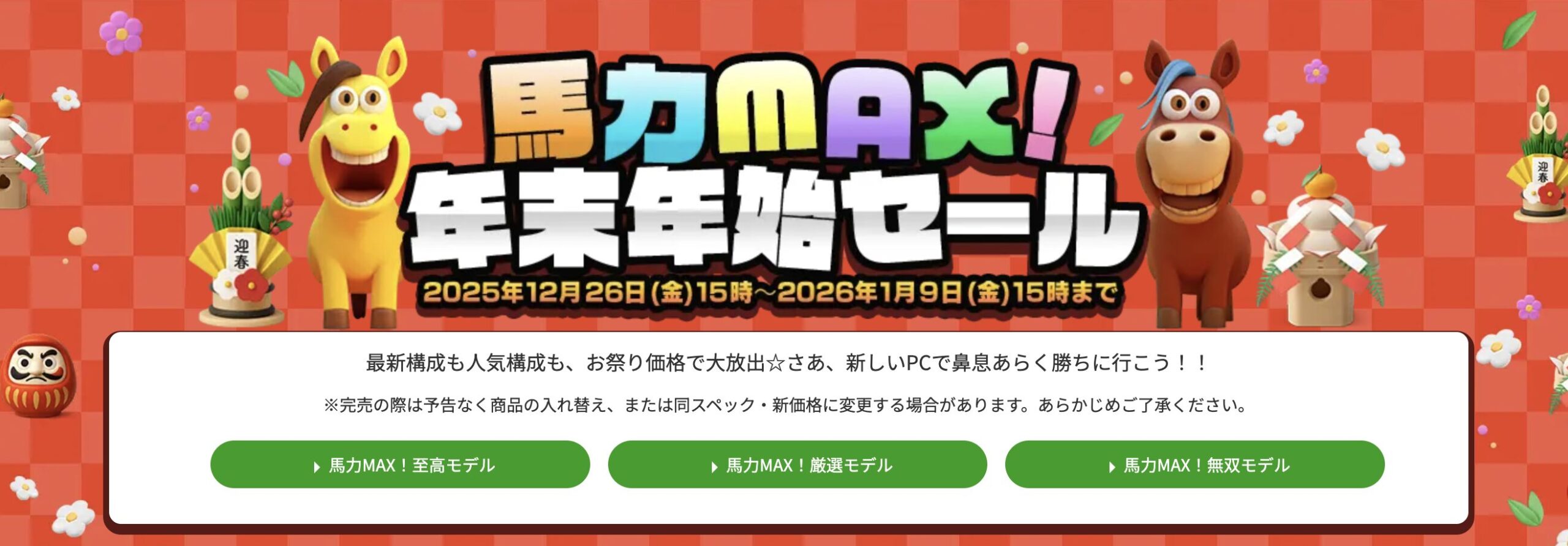 馬力MAX!年末年始セールでは「馬力MAX!至高モデル」「馬力MAX!厳選モデル」「馬力MAX!無双モデル」「即納モデル」の4ジャンル、合計21モデルが限定特価で販売中です。