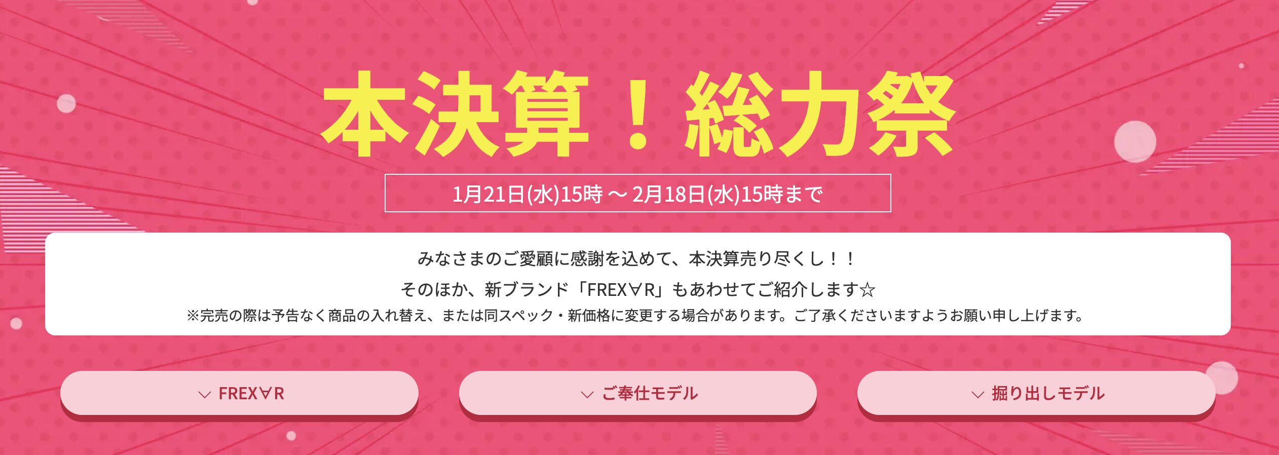 本決算!総力祭では「FREX∀R(フレクサー)」「ご奉仕モデル」「掘り出しモデル」の3ジャンル、合計18モデルが販売中です。