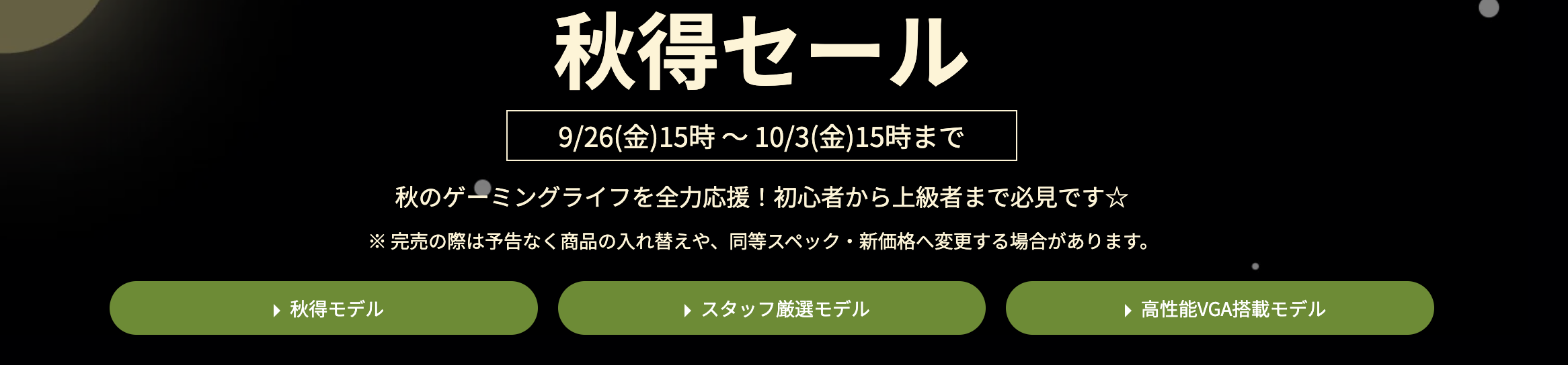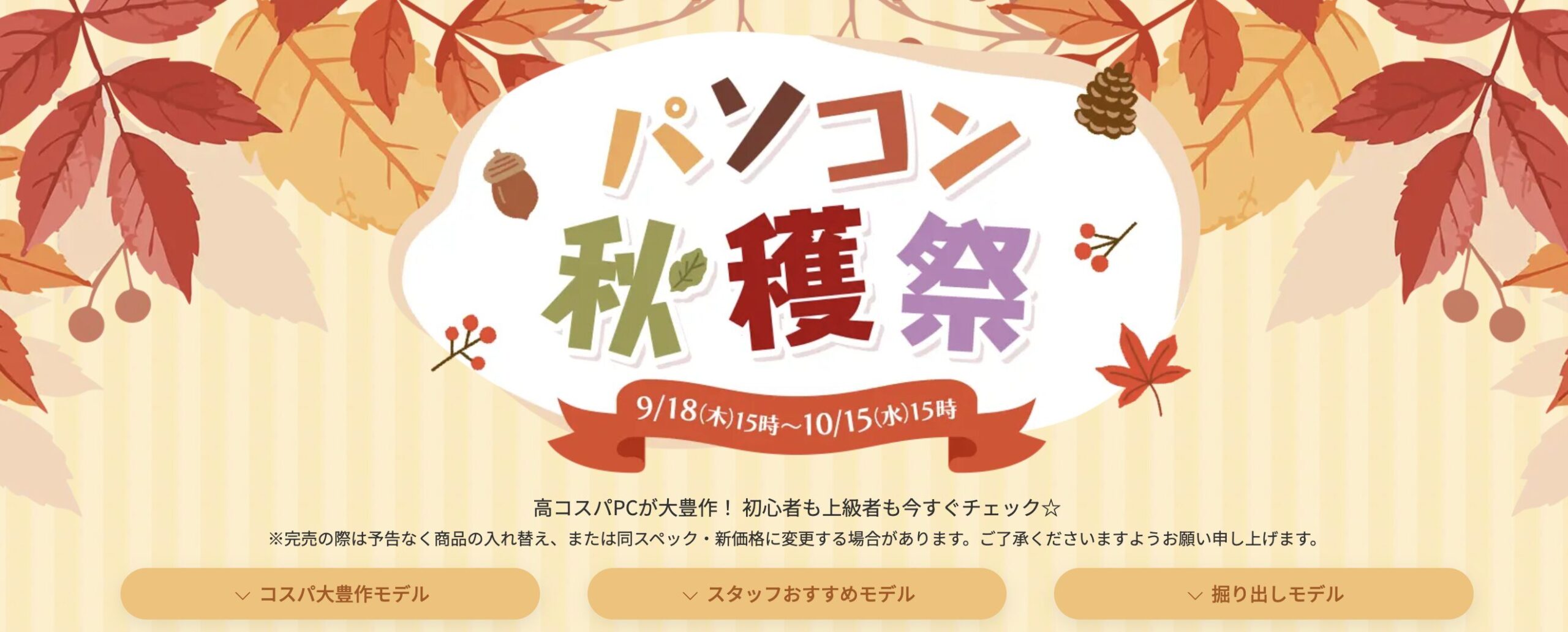 秋得セールでは「秋得モデル」「スタッフ厳選モデル」「高性能VGA搭載モデル」「即納モデル」の4ジャンル、合計24モデルが限定特価で販売中です。