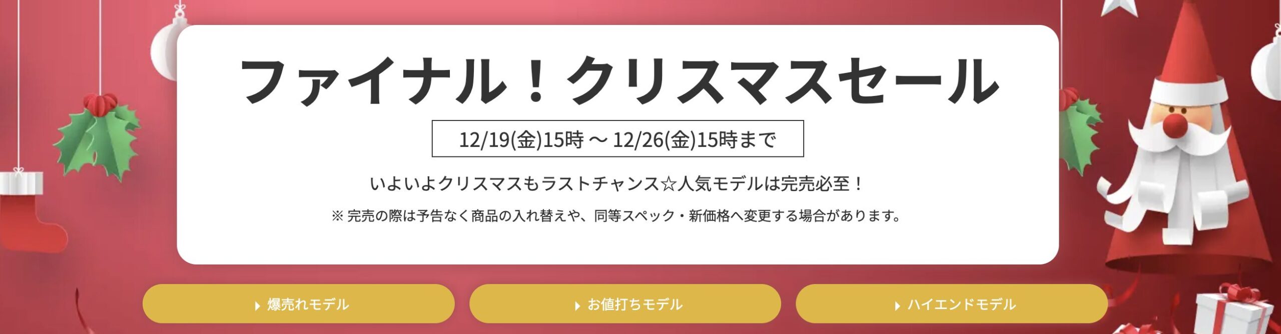 馬力MAX!年末年始セールでは「馬力MAX!至高モデル」「馬力MAX!厳選モデル」「馬力MAX!無双モデル」「即納モデル」の4ジャンル、合計21モデルが限定特価で販売中です。