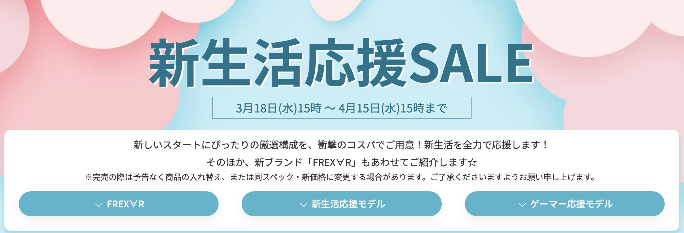 新生活応援SALEでは「FREX∀R(フレクサー)」「新生活応援モデル」「ゲーマー応援モデル」の3ジャンル、合計18モデルが販売中です。