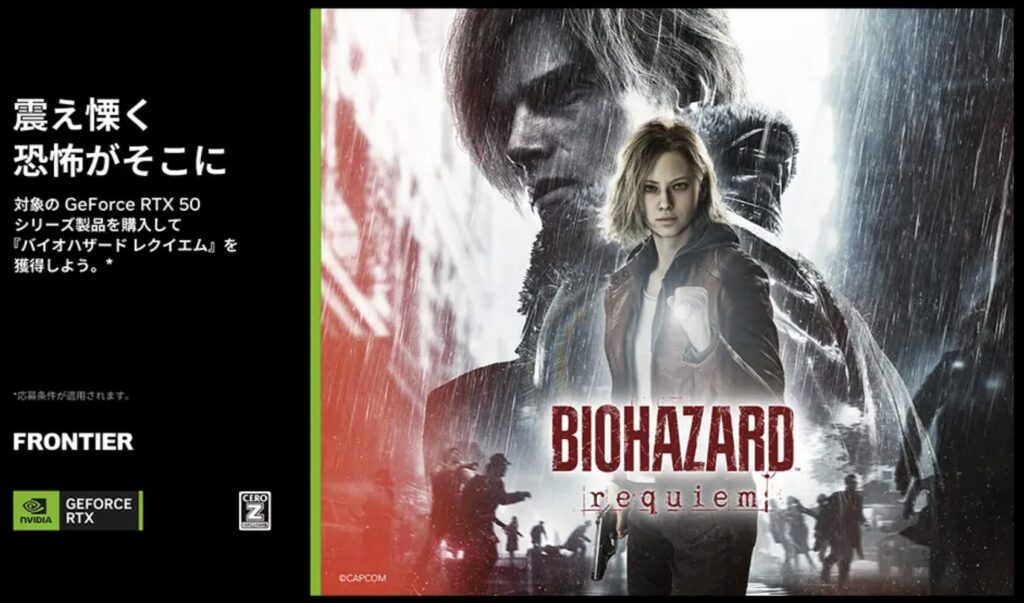 期間中にGeForce RTX 5090 / 5080 / 5070 Ti / 5070 搭載の対象デスクトップPC・ノートPCを購入すると、『バイオハザード レクイエム』のバンドルクーポンがもらえるキャンペーンです。