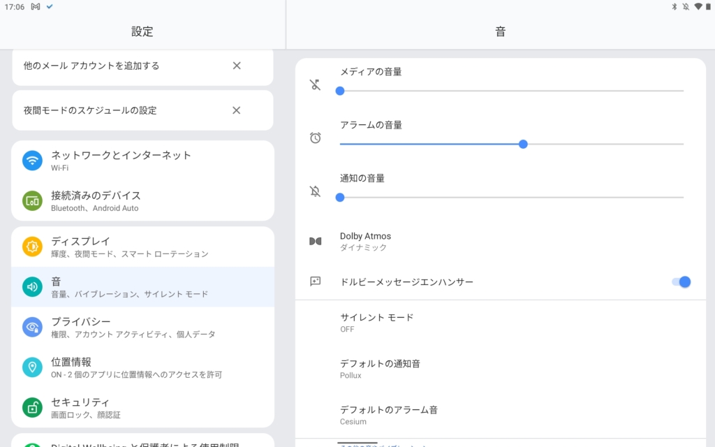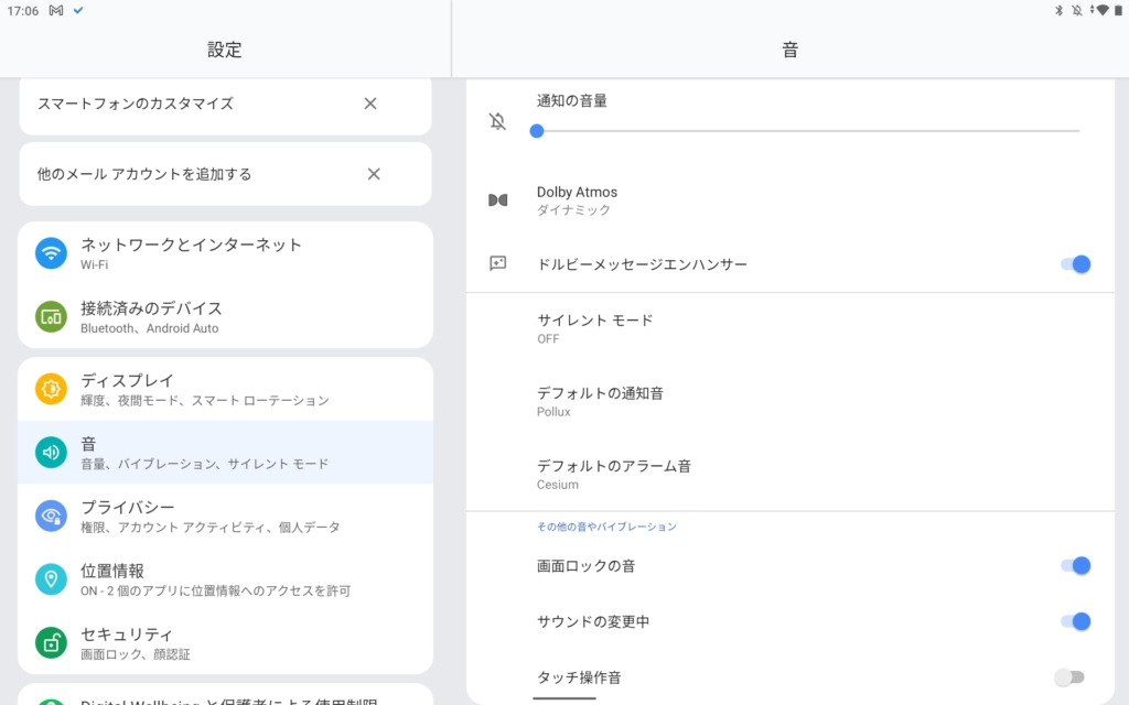 通知音〜アラーム音の音量、変更に加え、ロック音のON、OFF、タッチ操作音も切り替えられます。