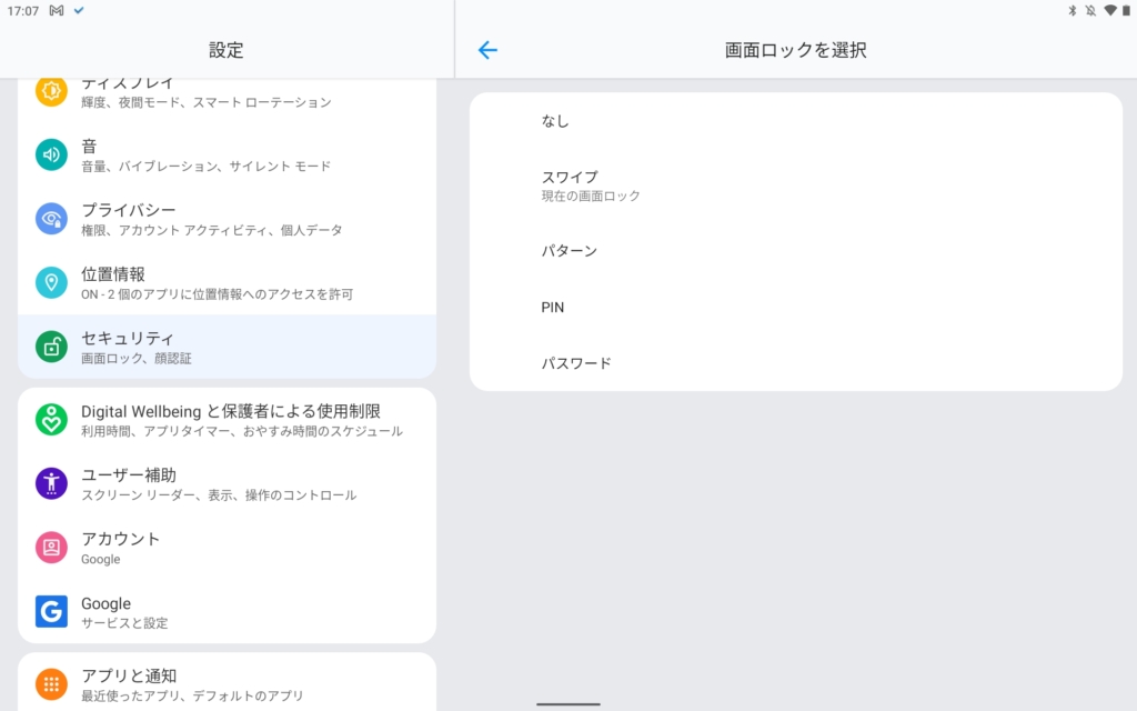 上記画像記載の「スワイプ、パターン、PIN、パスワード」に加えて、「顔認証機能」も搭載。
