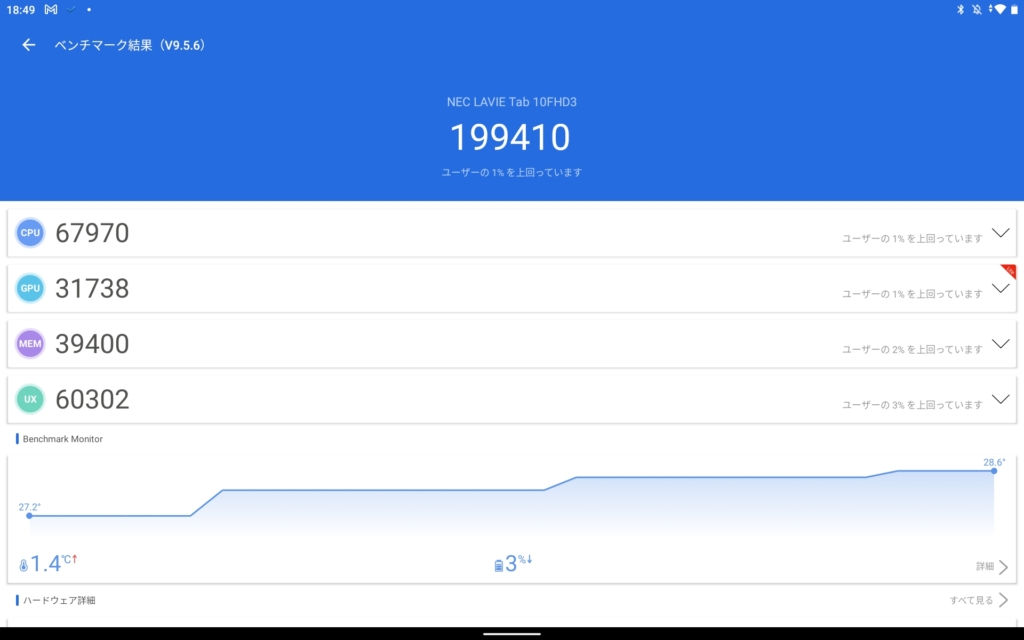 ここからは、スマートフォン&タブレット専用のベンチマークテスト用ソフトである「AnTuTu」を使用して、LAVIE Tab T10のスコアを調べてみます。