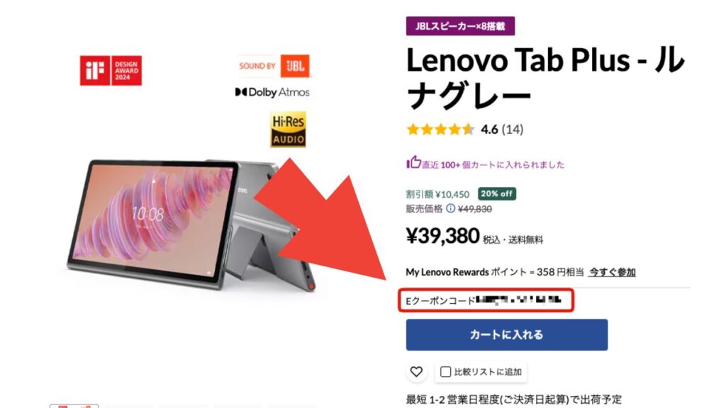 「Lenovo Tab B11」の場合|→30,800円 [14%OFF]円35,860