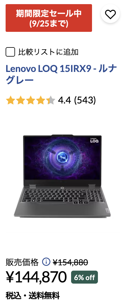 「Lenovo LOQ 15IRX10 – ルナグレー」→131,762円 [16%OFF]円156,860