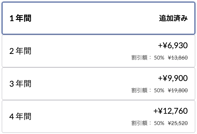 延長保証が割引きキャンペーン中かどうかは、製品をカートに入れる手前の画面で確認することができます。