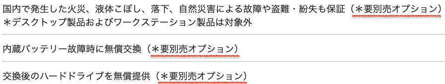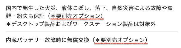 一見すると「プレミアサポート」にも「物損保証」「バッテリー無償交換」「ハードドライブ無償提供」がついているように見えますが、後述するオプションサービスを付与しなければ適用されません。