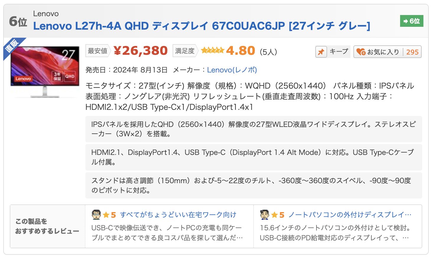 価格.comの「PCモニター・液晶ディスプレイ 人気売れ筋ランキング」を見てみると6位にレノボのモニターが掲載されています。