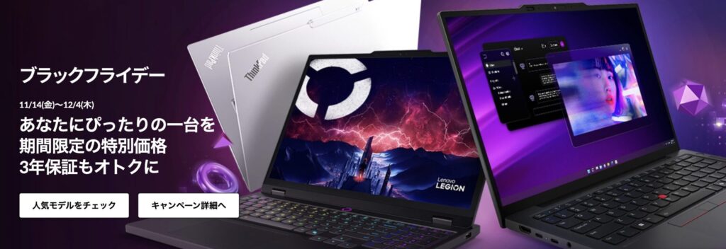 【2025年11月】レノボ最新セール時期。いつからいつまで開催される? 2025 11/15 広告 レノボ セール 2025年11月15日 こちらの記事では、 lenovo最新セール・キャンペーン情報 lenovoセールやキャンペーンが行われる時期に関して lenovoセールやキャンペーン期間の目安 上記内容に関して記載してきます。 レノボでは、定期的にPCが大幅値引きされるセールと、ポイント還元や製品プレゼントが行われるキャンペーンが開催されています。 言わずもがな、PCはこのようなセール時に購入するのが最もお得であるため、セール情報は随時チェックしていきましょう。 現在レノボで開催中のSALE一覧 セール一覧 ブラックフライデー 開催中 72時間セール