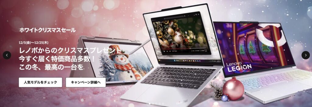 【2025年11月】レノボ最新セール時期。いつからいつまで開催される? 2025 11/17 広告 レノボ セール 2025年11月17日 こちらの記事では、 lenovo最新セール・キャンペーン情報 lenovoセールやキャンペーンが行われる時期に関して lenovoセールやキャンペーン期間の目安 上記内容に関して記載してきます。 レノボでは、定期的にPCが大幅値引きされるセールと、ポイント還元や製品プレゼントが行われるキャンペーンが開催されています。 言わずもがな、PCはこのようなセール時に購入するのが最もお得であるため、セール情報は随時チェックしていきましょう。 現在レノボで開催中のSALE一覧 セール一覧 ブラックフライデー 開催中 72時間セール