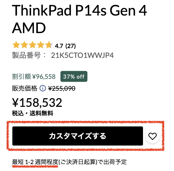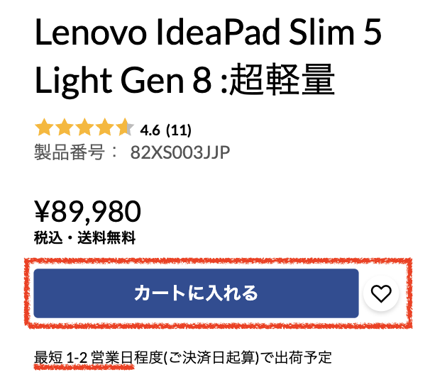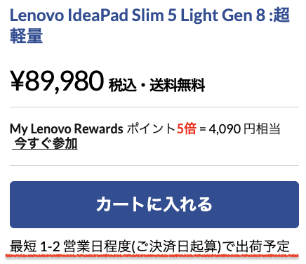 レノボの即納モデルには「決済日から、最短翌営業日~2営業日(ご決済日起算)で出荷予定」と記載されています。