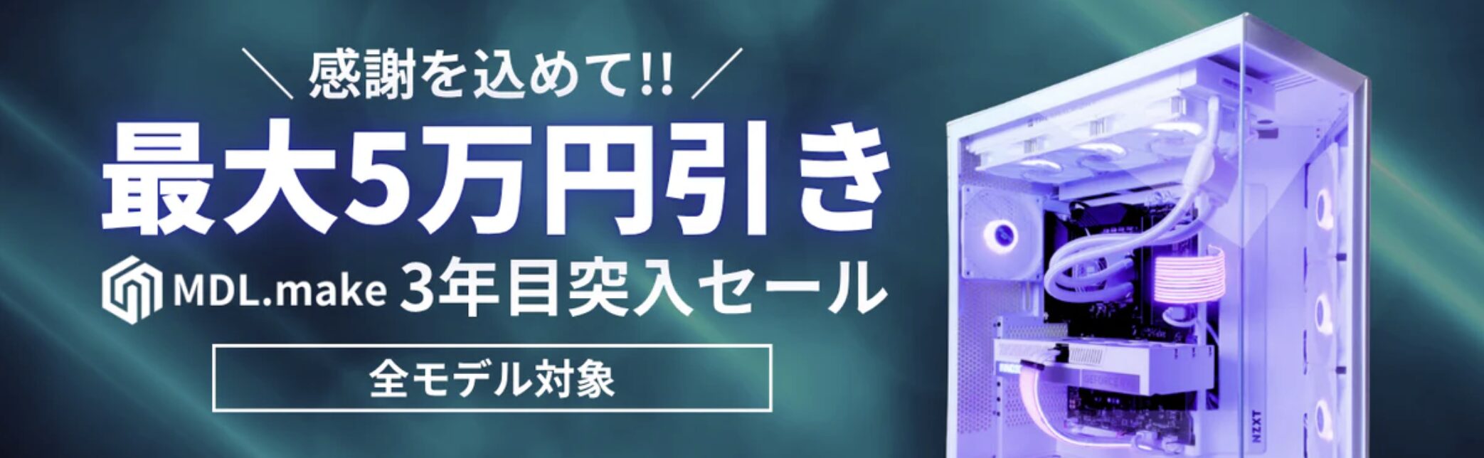 MDL.makeが3周年目に突入とのことで、最大5万円引のセールが開催中です。