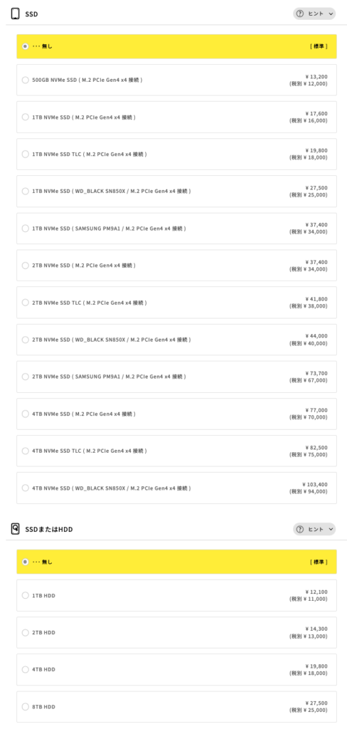 2,3個目の「SSD」「SSDまたはHDD」について