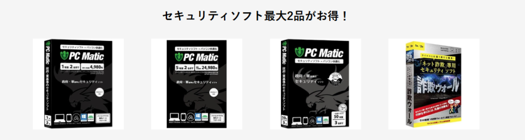 前回セールに引き続き、今回もモデルによっては「ネット詐欺専用のセキュリティソフト」と「パソコン快適化統合ソフト」が無料でゲットできます。