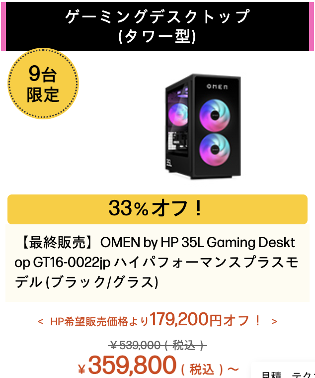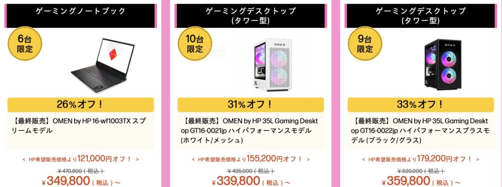 10%以下の値引き率が多い中、HPでは脅威の30%OFF越えアウトレットゲーミングPCが執筆時点で8種類確認できました。
