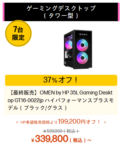 HPのアウトレットゲーミングPCは最も値引き率が高く、お得度合いからもおすすめできます。