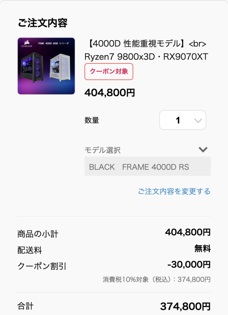 BTOカスタマイズを行っても、多くの場合は「カート合計金額」に対してクーポンが適用されます。