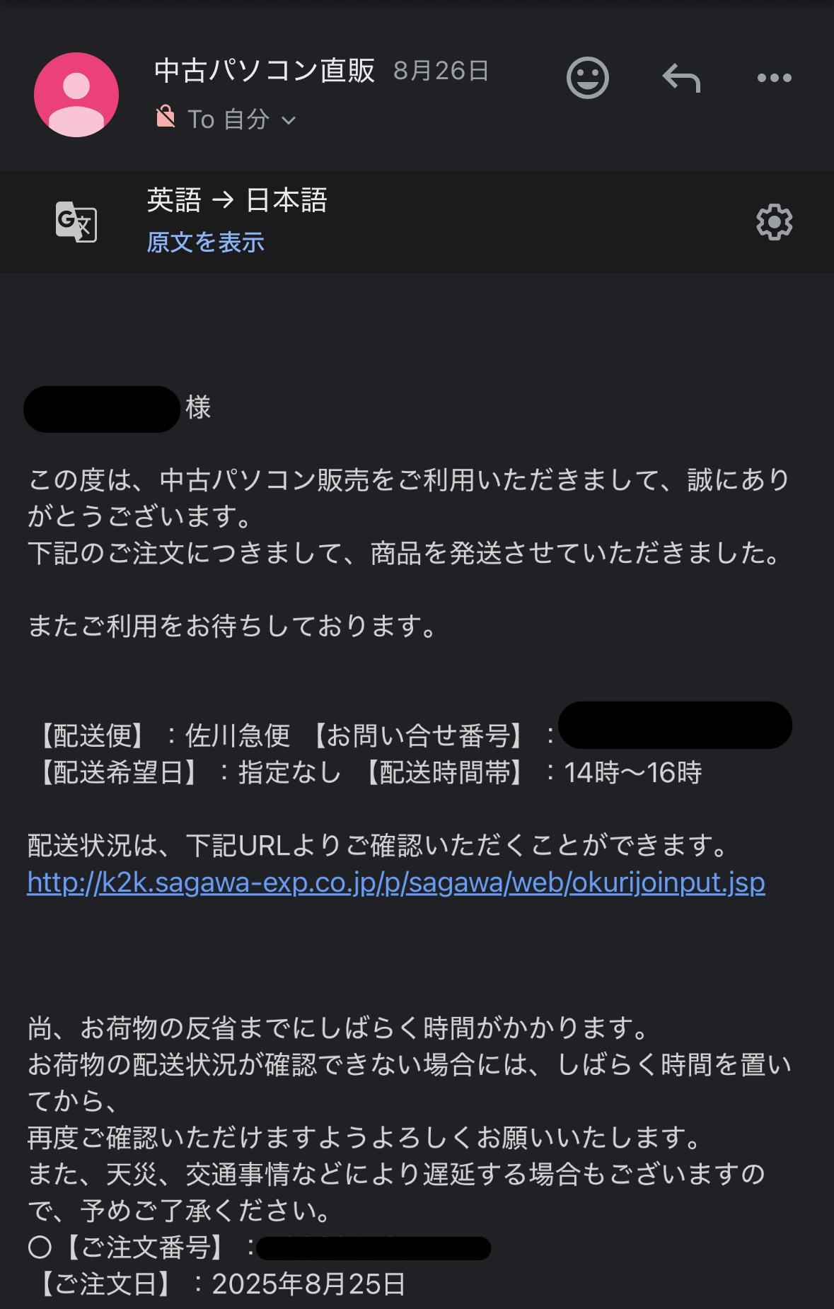 - 8月26日 18:53|PCパソコン直販から発送メールが届く