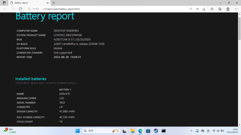 バッテリーの最大容量も、連続で高負荷作業をしなければ問題なさそうですが、今後気になるようなら交換をしてみたいと思います。(メモリはオンボード仕様なので増築不可)