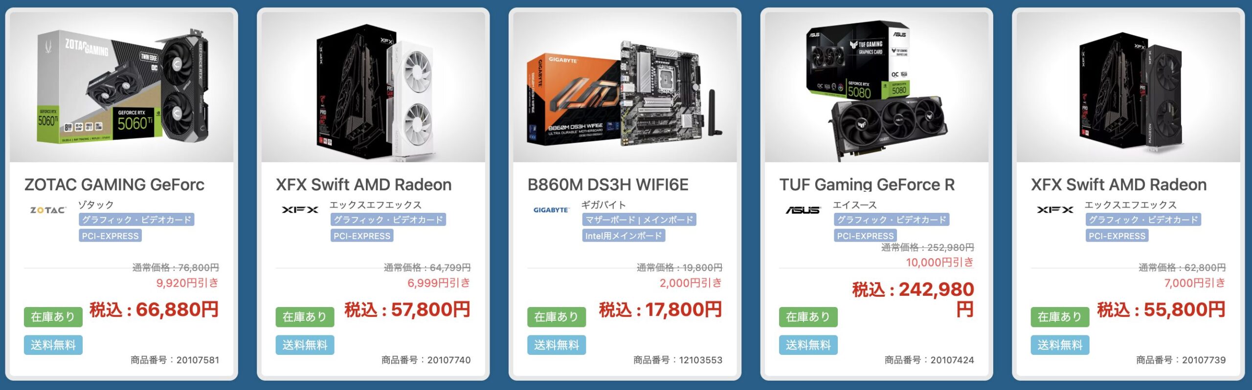 イヤバズもざっくりチェックしましたが、近年買い時と言われているGPUが魅力的な価格となっています。