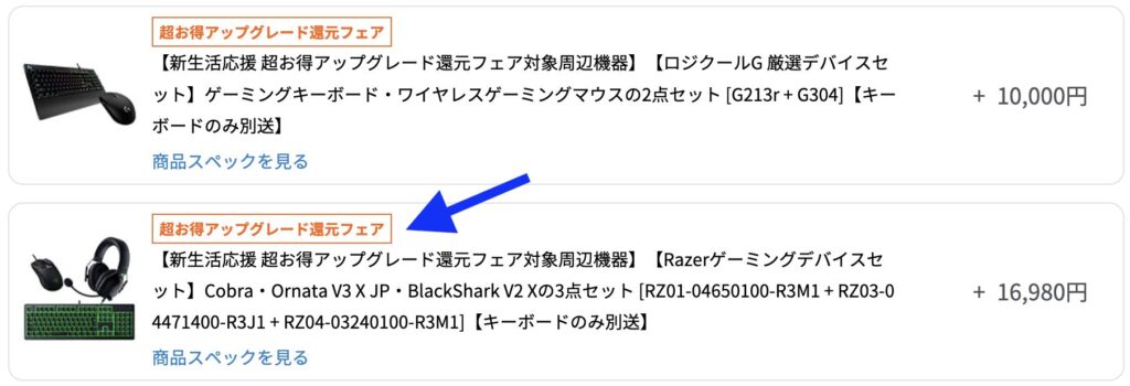 対象アップグレード/周辺機器の追加1品あたり2,000円分相当の還元です。