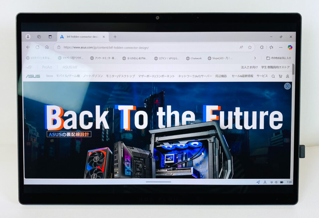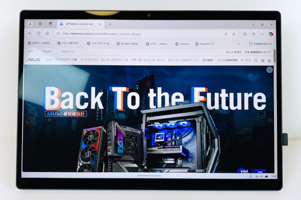 タブレットモードでやればデスクぎりぎりに設置できるからコンパクトボディでも綺麗な映像をしっかり見れるよ!