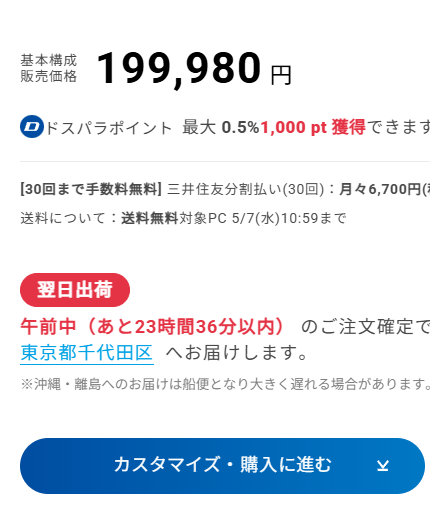 ドスパラは即納対応モデル数が圧倒的に豊富で、最短当日出荷に対応しているため欲しい構成モデルがすぐ手元に届きます。