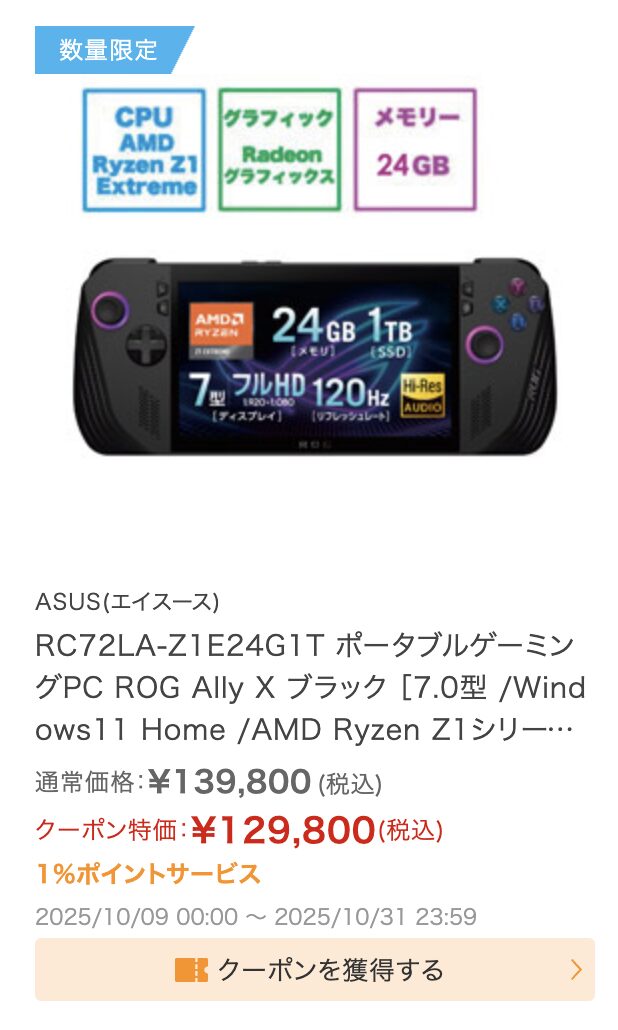 今回は「ROG Ally X」が10,000円OFFになっております。