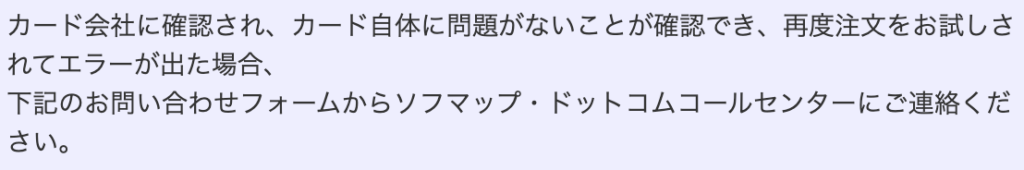 まず最初に確認して欲しい内容が、ソフマップでは利用できないクレジットカードを使用したかどうかです。