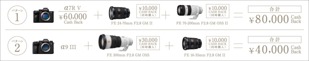 今回は本シリーズに加え「FE 300mm F2.8 GM OSS」などの望遠単焦点レンズなどを同時購入することで、商品額に応じたキャッシュバックがもらえます。