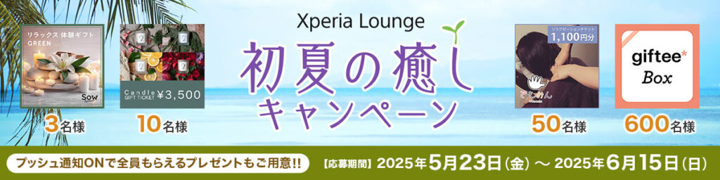 こちらはXperia Loungeにサインイン&エントリーするだけで、総額20万円分の商品が当たるかもしれない嬉しいキャンペーンです。