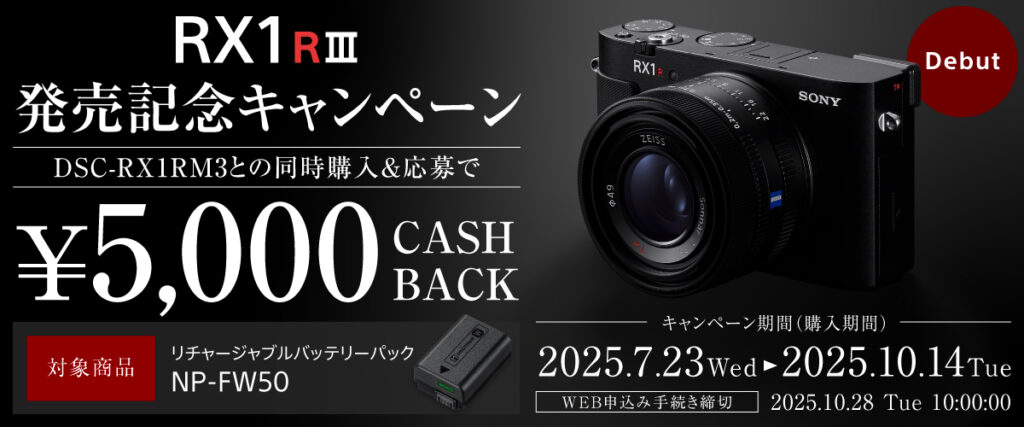 今回は「RX1R III」と対応バッテリーを購入&キャンペーンにエントリーで、応募者全員に5,000円のキャッシュバックがもらえる嬉しい内容。
