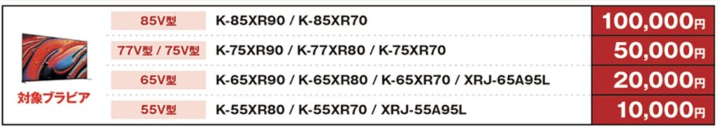 対象のテレビを購入すると最大で15万円キャッシュバックが還元されますので、これから大型テレビ購入や買い替えを検討している人には非常に嬉しい内容ですね。