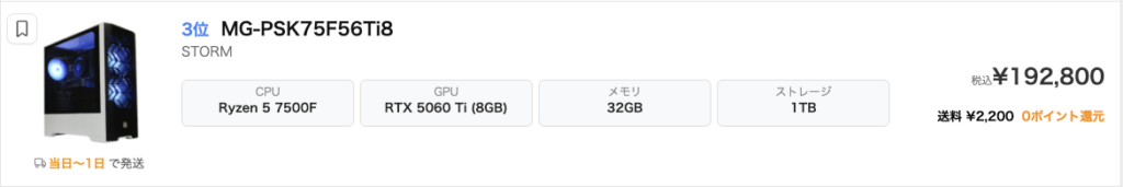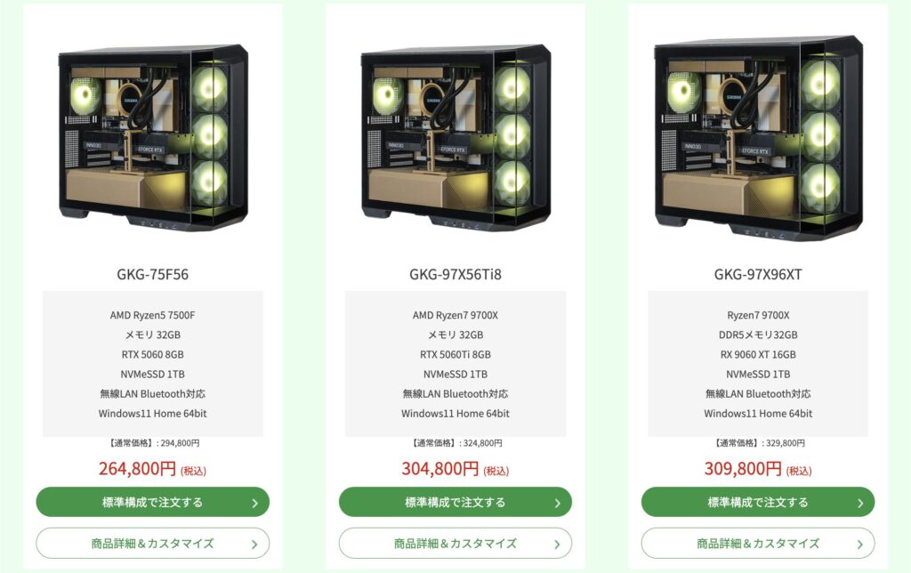 「Ryzen7 9800X3D」と「RTX5070Ti」を搭載しているハイスペックPCが40万円前半となっており、他メーカーのモデルと比較しても圧倒的に安いです。