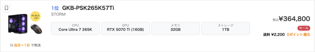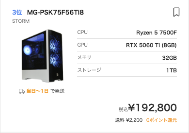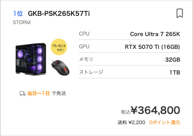 中でも、ゲーミングPC検索サイト『gg』にて1位を獲得している「GKG-98X3D57Ti」は、「RTX5070Ti」を搭載しているモデルの中でもコスパが良いことで人気です。