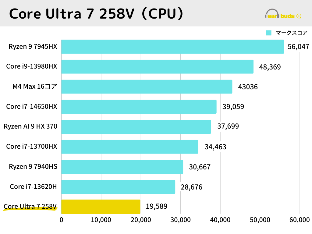 Core Ultra 7 258Vは省電力稼働が得意なCPUで、低負荷時に4つのEコアで処理を行うことにより、動画再生時などの低負荷時はバッテリー消費を抑えてくれます。