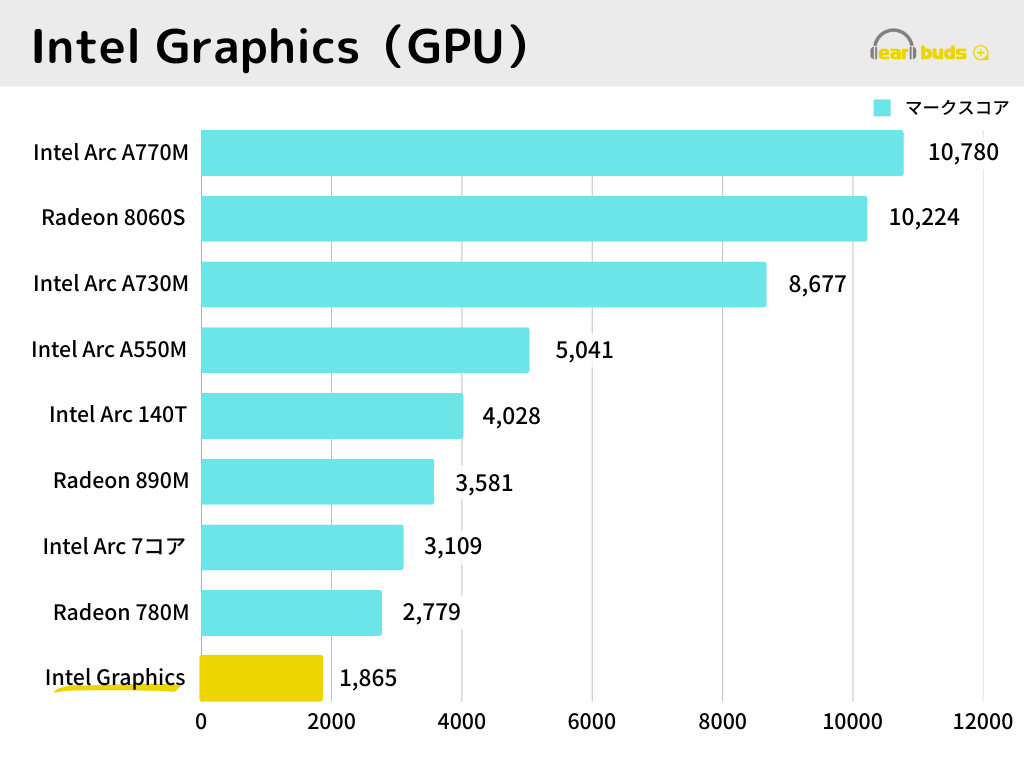 搭載GPUはIntel Ark GraphicsではなくIntel Graphicsなので、グラフィック性能は標準レベルです。
