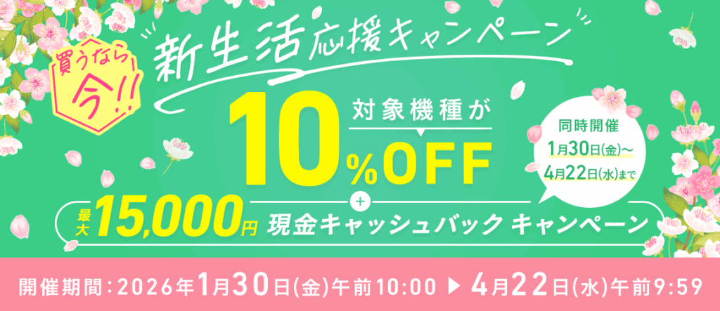 - 対象商品が10%OFFに加え、最大15000円キャッシュバックも開催!